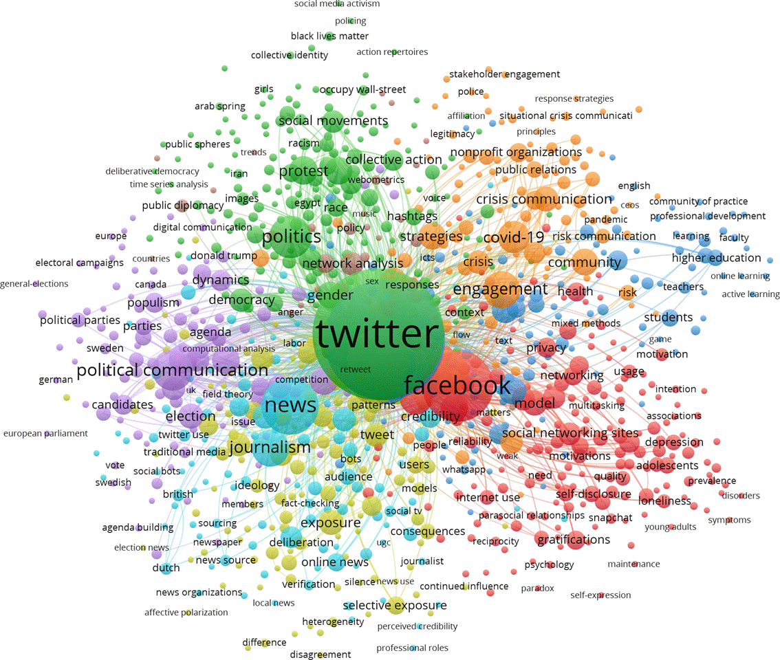 - 使用Web of Science在线数据库,以SCIE和SSCI为检索范围,搜索以Twitter为主题的学术论文,截至2022.12.05,共有16614项返回结果,均发表于Twitter问世的2006年至今。其中中观主题(Topics Meso)为Communication的有3669篇,用VOSviewer对这3669篇论文进行All keywords的Co-occurrence分析,限制为只统计共现5次以上的关系。生成的关键词共现网络如上图。图中节点的大小代表词频,连线代表共现存在共现,并用不同颜色标识出7个显著的Clusters和1个较不明显的由其他小型Clusters合并得来的Cluster,其所代表的研究热点大体可以描述为: